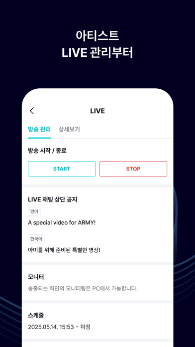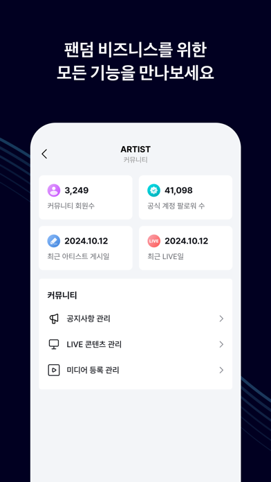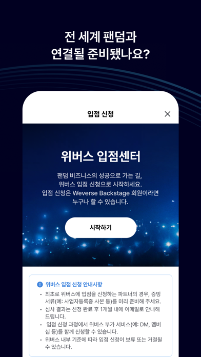 ■ Weverse 입점 신청 아티스트와 파트너를 위한 친절한 가이드와 함께 쉽고 빠르게 입점을 신청해 보세요. 입점 신청의 문은 언제나 열려 있습니다. ■ 파트너를 위한 All-in-One 솔루션 아티스트의 LIVE·미디어 관리부터 까지, 팬덤 비즈니스를 위한 모든 기능을 제공합니다. ■ 다양한 비즈니스 모델 적용 위버스는 팬 활동이 더욱 행복할 수 있도록 즐거움과 편의성을 높인 최고의 서비스를 제공합니다. 비즈니스 성장을 위한 수익 모델을 도입해 팬과 아티스트를 더욱 가깝게 연결해 보세요. [위버스 백스테이지 공식 웹사이트] https://backstage.weverse.io/ [서비스 접근 권한 안내] *필수 접근 권한 - 기기, 앱 기록 : 앱 오류 확인 및 사용성 개선 - 기기 ID : 기기 식별 *선택 접근 권한 - 카메라 : 포스트 작성, 이미지 인식, 영상 녹화 - 알림 : 콘텐츠 및 공지사항 등의 알림 *선택 접근 권한은 동의하지 않아도 서비스를 이용할 수 있습니다. 미동의 시 일부 기능이 제한될 수 있습니다.
