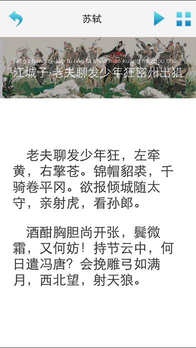 每日必听国学,一个软件,一部有声诗集,一本精美的图文杂志,学习中华国学的好帮手。《初中生必背古诗文》根据《新课标》制定的标准,选取有代表性的名篇,共69首(篇),进行注释、浅易、赏析,为广大中学生提供一把学好古诗文的金钥匙。 *翻一翻,每一篇诗文都是经典。 *听一听,听多了自然会背。 *读一读,读诗百遍,其意自现。 *查一查,古诗文注音、注解、译文和评析。 *背一背,文以载道,培养中华文化基本修养和人格修养。 【软件功能】 *每一篇诗文配有精美图文(诗意)、名家诵读。 *听一听,支持自定义连读范围和播放次数,适合睡觉前或空闲时间,让孩子听听,听多了自然会背 *练一练,每篇古诗文提供3~10道练习题(对诗句、难字填空、拼音选择等)。 *每一篇诗文提供注解、译文和评析。“注解”对难懂的字词、典故、地名进行通俗易懂的解释,以帮助学生完整理解古诗文的基本意思。“译文”采用简单的语言对原文进行翻译。“评析”尝试用散文化的语言诠释古古诗文的意境,启发学生的艺术想象能力。 *每一古诗文作者提供简介、主要成就、特点、风格或流派及传世佳句等介绍,部分作者配有画像。 *每一古诗文内容、注解、译文、评析及作者介绍均支持转发到新浪微博或邮箱,便于二次学习和重点关注。 *提供分类查询、按作者查询、关键字搜索查询等。 *提供我的收藏功能,可以将部分难记或需要重点背诵的古诗文加入我的收藏。 *提供微博互动,方便广大学生和家长交流和互动。 【软件内容】 1.[孔子]论语 2.[孟子]鱼我所欲也 3.[孟子]生于忧患,死于安乐 4.[左传]曹刿论战 5.[战国策]邹忌讽齐王纳谏 6.[诸葛亮]出师表 7.[陶渊明]桃花源记 8.[郦道元]三峡 9.[韩愈]杂说四 10.[刘禹锡]陋室铭 11.[柳宗元]小石潭记 12.[范仲淹]岳阳楼记 13.[欧阳修]醉翁亭记 14.[周敦颐]爱莲说 15.[苏轼]记承天寺夜游 16.[宋濂]送东阳马生序(节选) 17.[诗经]关雎 18.[诗经]蒹霞 19.[曹操]观沧海 20.[陶渊明]饮酒 21.[王勃]送杜少府之任蜀州 22.[王湾]次北固山下 23.[王维]使至塞上 24.[李白]闻王昌龄左迁龙标遥有此寄 25.[李白]行路难 26.[杜甫]望岳 27.[杜甫]春望 28.[杜甫]茅屋为秋风所破歌 29.[岑参]白雪歌送武判官归京 30.[韩愈]早春呈水部张十八员外 31.[刘禹锡]酬乐天扬州初逢席上见赠 32.[白居易]观刈麦 33.[白居易]钱塘湖春行 34.[李贺]雁门太守行 35.[杜牧]赤壁 36.[杜牧]泊秦淮 37.[李商隐]夜雨寄北 38.[李商隐]无题 39.[李煜]相见欢 40.[范仲淹]渔家傲 41.[晏殊]浣溪沙 42.[王安石]登飞来峰 43.[苏轼]江城子·老夫聊发少年狂密州出猎 44.[苏轼]水调歌头·明月几时有 45.[陆游]游山西村 46.[辛弃疾]破阵子醉里挑灯看剑 47.[文天祥]过零丁洋 48.[马致远]天净沙秋思 49.[张养浩]山坡羊潼关怀古 50.[龚自珍]已亥杂诗 51.[曹操]龟虽寿 52.[陶渊明]归园田居 53.[乐府诗集]木兰辞 54.[孟浩然]望洞庭湖赠张丞相 55.[李白]渡荆门送别 56.[李白]宣州谢跳楼饯别校书叔云 57.[崔颢]黄鹤楼 58.[杜甫]登楼 59.[杜甫]石壕吏 60.[常建]题破山寺后禅院 61.[韩愈]左迁至蓝关示侄孙湘 62.[刘禹锡]秋词 63.[白居易]卖炭翁 64.[温庭筠]忆江南 65.[苏轼]浣溪沙 66.[李清照]醉花阴 67.[李清照]如梦令 68.[辛弃疾]西江月 69.[赵翼]论诗五绝(其二) 【每日必听国学.教材一览】 1、唐诗300首(有声图文典藏版) 2、唐诗300首(有声图文简约版) 免费 3、宋词300首(有声图文版) 4、宋词300首(有声图文Lite版) 免费 5、小学生必背古诗80首 6、初中生必背古诗文 7、高中生必背古诗文