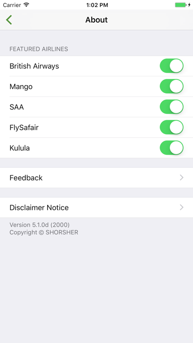 FLY DOMESTIC, FIND THE CHEAPEST FLIGHT! The real simplest DOMESTIC flight search application that you can compare price from major local airlines in South Africa, quickly and easily from your iPhone/iPad. All available flights are provided in 3 categories; by price, departure time, and by airlines, to maximally facilitate your comparison. The results shown in the app are collected from each airlines website directly in every search you make. Therefore, price & flight information you can get from the app, is always REAL-TIME updated. Features: • SEARCH all domestic flights in South Africa • COMPARE & find the right flight for you Featured Airlines: • British Airways • FlySafair • Kulula • Mango Airlines • South African Airways ======== Remarks: ======== The results you get from the app are real-time collected from each airlines website directly in every search you make, to get the most updated information. If the results in the official airlines website could not be provided due to its internal problems, then our app may not get completed results and there will be a pop-up reporting notice in the app. However, if there are significant changes in the searching systems in the airlines websites, we will provide an update ASAP. Please feel free to give us information or notify any bugs you notice from our About page in the app, so that we can get more details to solve the problem for you accordingly.