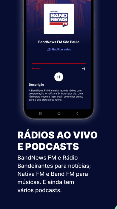 Tudo que passa na tela da Band está aqui! Veja e reveja seus programas favoritos quando e onde você quiser: Da Fórmula 1 aos Donos da Bola, do Masterchef ao Melhor da Tarde, dos telejornais às rádios do Grupo Bandeirantes. No Bandplay, você tem o controle da programação! E não para por aí: ainda tem filmes, séries, realities, documentários, animes, desenhos e podcasts atualizados a cada semana. Baixe agora o Bandplay, cadastre-se e aproveite! Se precisar de ajuda sobre nossos serviços, é só nos chamar pelo @bandplay nas redes sociais, ou através do e-mail [email protected].