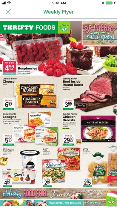 Planning your grocery shopping has never been so simple, enjoyable, or inspiring: * Create your shopping lists while choosing from over 30,000 products. * Scan an item's bar code to add it to any list you choose. * Send your lists by text, email, or Messenger. * Optimize your time in store thanks to shopping lists that are arranged like the grocery sections in your favourite Thrifty Foods store. * Receive inspiring recipe ideas and add the ingredients directly to one of your shopping lists. * Order your groceries and choose home delivery or in-store pick-up. * Consult the weekly flyer on your mobile phone. * Benefit from customized offers based on your regular purchases. *** Shop for groceries more efficiently in the comfort of home or at the store. The Thrifty Foods mobile app is the perfect tool for grocery planning, from making your lists to purchasing your items. In addition to the functions listed above, don't miss a single weekly offer with your mobile app flyer. Wondering about the price of an item? The app provides information about products and current prices at your favourite Thirfty Foods supermarket. Your thriftyfoods.com account synchronizes with the app. The app is completely free and a network connection is required to maximize its use. Download it today and change the way you shop for groceries!