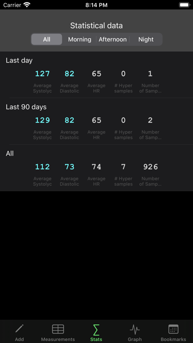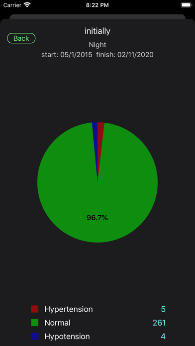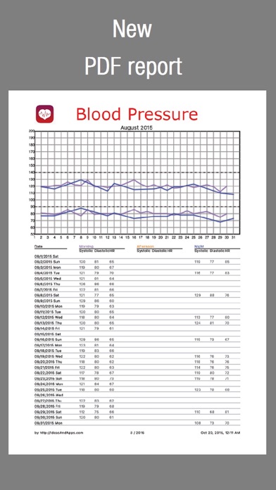 This application is ideal for carrying a daily log of blood pressure measurements. It allows you to record separately the measurements made in the morning, afternoon and evening. When a measurement is outside the range of normal values it will be marked on red color. You can export data or send by email in CSV or HTML format so that it can be included in a spreadsheet. You can mail an elegant PDF document with the measures grouped by months. You can import data in CSV format using itunes or sending by email. It shows the data in a graph in such a way that you can move your finger to the date you want and include tags to bookmark a date that has a special interest for you (for example the start of a treatment). Shows the average blood pressure values of the last week, last month, last three months .. Also shows statistical data between the bookmarked dates. Shows statistic in a pie-chart graphic.