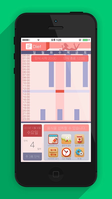 다이어트를 하면서 가장 힘들었던적은 언제였습니까? 먹고싶은 음식을 못먹을때? 남들이 정신적으로 스트레스를 줄때? 열심히 운동했는데도 살이 안빠질때? 이러한 모든 것들을 해결해줄 앱이 드디어 나왔습니다. 몸매를 가꾸기위해 건강을 버려가면서하는 다이어트는 이제 버리십시오. 건강한 다이어트, 마음껏 먹으면서 빼는 다이어트, 최상의 몸매를 유지를 위해 당신을 에스코트 해 줄 SBS스페셜에서도 소개한 “간헐적 단식 다이어트 앱”! 당신의 몸매를 건강하고 늘씬하게 만들어 드립니다. 요즘시대에 남성분들도 예외는 아닙니다. 기능들 - 단식 요일,시간 사용자 설정. - 단식 시간 알람 설정. - 단식 기간 아이콘 뱃지 표시. - 단식 시간 카운트 다운. - 몸무게 그래프 관리. - BMI지수 측정기. - 음식 칼로리 사전. - 음식 칼로리 즐겨찾기. - 다이어트 다이어리. - 몸무게 단위 kg, lb지원. - iOS7 플랫 디자인 적용. - 쉬운 UI로 편리한 사용방법. 앱스토어에서 이제까지 볼 수 없었던 최고의 다이어트 앱 입니다.