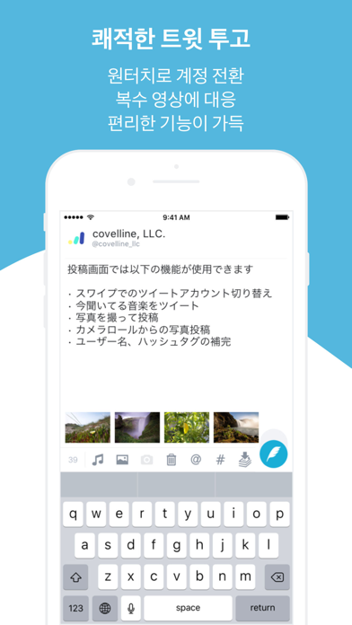 일본 SNS 랭킹 1위를 차지한 심플하고 스마트하며 세련된 트위터 앱을 사용해 보시지 않겠습니까? feather for Twitter는 Twitter를 더욱 편리하게 이용할 수 있는 앱입니다. ◆◇ 이런 분께 추천 ◇◆ • 여러 계정을 구분하여 사용 • 홈 타임라인보다 리스트를 더 자주 확인 • 많은 양의 검색 키워드를 매일 체크 • 보고 싶지 않은 트윗이 있음 • 타임라인 광고를 보고 싶지 않음 ーーーー 앱 특징 ーーーー • 좋아하는 화면을 등록할 수 있는 탭 • 보고 싶지 않은 트윗은 표시하지 않는 파워풀한 뮤트 기능 • 세련된 테마 • 한 손으로 조작 가능한 간단한 디자인 등등 편리한 기능들로 가득합니다! ーーーーーーーーーー 무료 버전과 다른 점 ーーーーーーーーーー 유료 버전은 광고가 표시되지 않습니다 사용 가능한 기능 • 계정(무료 버전: 2개까지 / 유료 버전: 무제한) • 탭(무료 버전: 같은 종류당 2개까지 / 유료 버전: 무제한) • 키워드 뮤트 • 해시태그 뮤트 • 클라이언트 뮤트 • 트윗 번역 • 정형문 트윗 • 반각 가타카나 입력 ーーーー 앱 기능 ーーーー ◆◇ 지금까지 없었던 탭 기능 ◇◆ 원하는 화면을 등록할 수 있는 탭 기능이 등장! 탭의 개수는 무제한! 탭이 많아도 탭 표시줄을 스와이프하면 쉽게 전환 가능 원하는 화면을 등록하고 자유롭게 앱을 커스텀해 보세요! 탭은 계정마다 다음과 같은 화면을 등록 가능 • 타임라인 • 멘션 • 목록 • 검색 • 즐겨찾기 • 브라우저 • 프로필 • 쪽지 기타 화면도 계속해서 추가 예정! ◆◇ 편리하고 즐거운 기믹 요소 ◇◆ 트윗을 스와이프하면 애니메이션과 함께 바로가기가 표시! 멘션이나 즐겨찾기, 리트윗 간 화면 이동은 전혀 필요 없음! 잘 정리된 디테일한 기믹이 중독성 있음! ◆◇ 많은 기능, 그러나 정돈된 게시 화면 ◇◆ 지금 듣고있는 음악을 흥얼거리거나 카메라롤에서 사진 게시도 한 탭에서 간편하게! 게시 화면에서 계정 전환 기능도 완벽하게! 게시 화면에서 다음과 같은 기능을 사용 가능! • 스와이프로 트윗 계정 전환하기 • 지금 듣고있는 음악을 트윗하기 • 사진을 찍어서 게시하기 • 카메라롤에서 사진을 게시하기 • 사용자 이름, 해시태그를 자동 완성 ◆◇ 트윗하고 싶어지는 트윗 버튼 ◇◆ 화면 하단에 트윗 버튼을 배치! 화면 위로 손가락을 벌리지 않아도 바로 트윗 할 수 있습니다 또한 취향에 맞게 자유롭게 트윗 버튼을 배치할 수 있습니다! 간편하게 이동할 수 있으니 기분에 따라 배치해 보세요! ーーーーーーーー feather 지지자 ーーーーーーーー feather의 개발을 응원하는 서포터가 되지 않습니까? 서포터가 되면 조금 기쁜 기능이 잠금 해제됩니다. • 정밀한 번역 기능 • 왠지 업데이트를 베이컨 이미지로 바꿀 수 있습니다. 서포터 플랜에 여러분이 등록해 주시면 특별한 기능은 점점 늘어나 갈지도・・・! ? 꼭 지원해 주세요! ーー 문의 ーー 앱에 대한 의견이나 요청 사항은 공식 Twitter 계정 (@feather_ios) 또는 이메일 ([email protected])으로 보내주시기 바랍니다! App Store에서의 평가보다 확실하게 의견을 청취할 수 있으므로 많이 이용해 주세요! 이용 약관: https://covelline.com/feather/terms 개인정보취급방침: https://covelline.com/feather/privacy ーーーーーー 翻訳の間違いに気がついた人は教えてくれると嬉しいです。