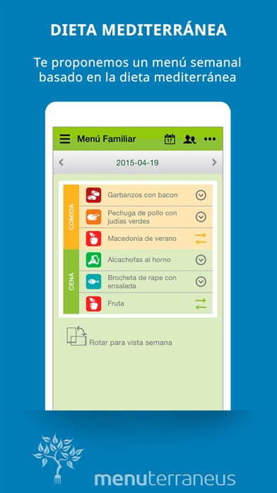 ¿Qué cenamos hoy? menuterraneus es la aplicación que te planifica un menú semanal equilibrado, siguiendo los principios de la dieta mediterránea. Además, si tienes hijos, el menú será complementario a su menú escolar. Puedes añadir tus propias recetas y así te las asignaremos más a menudo. Marca tus recetas favoritas y elimina las que no te gusten, así conseguirás un menú adaptado a los gustos de tu familia. Una vez generado el menú, elabora de forma automática la lista de la compra en tres sencillos pasos. Además, podrás disfrutar de cupones de descuento para los productos que tengas en tu lista. menuterraneus es una app y también una aplicación web. Puedes generar la lista de la compra desde el ordenador, y luego llevarla siempre contigo en el móvil. Y tu pareja podrá ir añadiendo productos a la lista mientras estés comprando, la lista se sincronizará en todo momento! Principales funcionalidades: - Menú semanal - Menú escolar de tus hijos - Cambio de plato - Listado de recetas - Añade tus propias recetas - Lista de la compra - Cupones de descuento