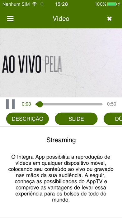 Apresentamos o AppTV, um aplicativo que revolucionará a maneira de assistir aos seus vídeos! Desenvolvido pela Netpoint, o AppTV possibilita a reprodução de vídeos em qualquer dispositivo móvel, entregando conteúdo ao vivo ou gravado nas mãos da audiência. Conheça as possibilidades do AppTV e comprove as vantagens de levar essa experiência no bolso. Interface: Permite aliar o conteúdo em vídeo a uma apresentação de slides em tempo real. Você pode redimensionar o vídeo para assisti-lo em tela cheia, podendo alternar entre vídeo ou slide e buscar no carrossel por slides já passados para a recordação de algum assunto anterior. Videoteca: Conta com um sistema de busca de arquivos em vídeos do acervo, categorizados por assunto, gênero, módulos, etc. Push Notification: O AppTV possui um sistema de envio de notificações ao usuário, com pop-up no próprio visor do seu dispositivo. Seja avisado quando uma transmissão ao vivo está prestes a começar ou quando há um novo vídeo disponível na videoteca.