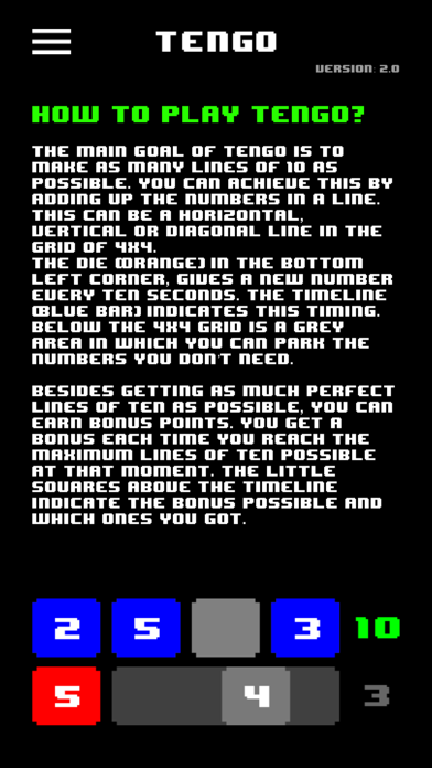 We invented this little online puzzle game called Tengo. Simple but surprisingly challenging. Well actually it can drive you mad! Unless you become good at it... The game is played on a square of 16 tiles. You will be given sixteen numbers to place on the tiles. Put the numbers in rows, in a way that each row adds up 10. The rows can be horizontal, vertical and diagonal.There are three tiles that can be used as parking spaces. Notice that you don’t have to use all numbers. Now good luck, and enjoy the game.