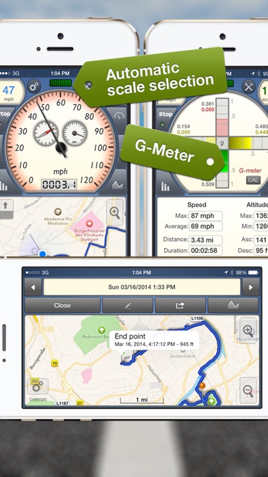 GPSSpeed Scooter is the ultimate speedometer for all iPhone/iPad with GPS. List of features: * Speedometer with speed profile * Altimeter with height profile history * Logs in sleep-mode if the application is running * Logs in background if supported by iOS * In statistics, the recorded profiles are available for analysis * Display the recorded tracks on the map * Display the current track on the map (Using maps requires internet connection) * These routes can be sent as an email in the formats KML, GPX and CSV with including histogram * Show average speed and track distance * Display of ascent and descent * G-Meter Continued use of GPS running in the background can dramatically decrease battery life. If the battery power is less than 10% it will stop background tracking! Please note that for an accurate speed and altitude measurement, a very good GPS signal is required. This signal is independent of the mobile phone reception. Within and between buildings, the reception is restricted. When you see just a red signal indicator the GPS reception is to bad. Please try again with a clear view to the sky. If you have any questions or problems, please feel free to send an email to appsupport [at] mwaysolutions.com We will attend to your request as soon as possible.