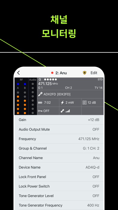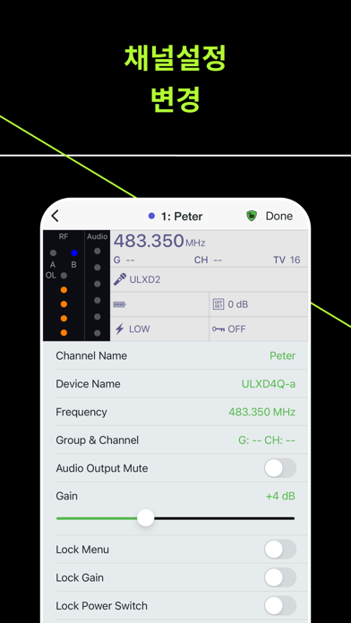 현장 곳곳을 다니며 ShurePlus™ Channels로 주요 Shure 무선 시스템 파라미터를 모니터링합니다. Wi-Fi를 통해 연결하여 호환되는 네트워크에 연결된 Shure 하드웨어를 자동으로 찾아 연결하며 RF 신호 세기, 오디오 레벨, 남은 배터리 수명 등 중요한 채널 정보를 모니터링합니다. ShowLink® Remote Control for Axient® 및 Axient 디지털 시스템과 함께 사용하면 송신기와 수신기 설정을 동시에 조정할 수 있습니다. 이는 Axient의 업계를 선도하는 기능 세트에 추가된 강력한 기능입니다. 호환 가능한 Shure 무선 제품 • Axient® Digital • Axient® • PSM®1000 • QLX-D® • UHF-R® • ULX-D® • SLX-D 기능 • Wi-Fi(802.11n 또는 802.11ac)를 통해 네트워크에 연결된 Shure 시스템을 자동으로 찾아서 연결합니다. • 정렬 가능한 채널 목록으로 무선 채널들 간에 신속하게 전환합니다. • RF 레벨 미터링 • 오디오 레벨 미터링 • 송신기 배터리 레벨 미터링 • 밴드, 그룹 및 채널 정보와 함께 주파수 할당 • RF 간섭 표시(Axient 디지털, Axient, SLX-D, ULX-D) • 암호화 상태(Axient 디지털, ULX-D, QLX-D) • 주파수 다이버시티 상태(Axient 디지털, Axient, ULX-D) • ShowLink 신호 세기(Axient 디지털, Axient) • 호환 시스템용 액세스 제어