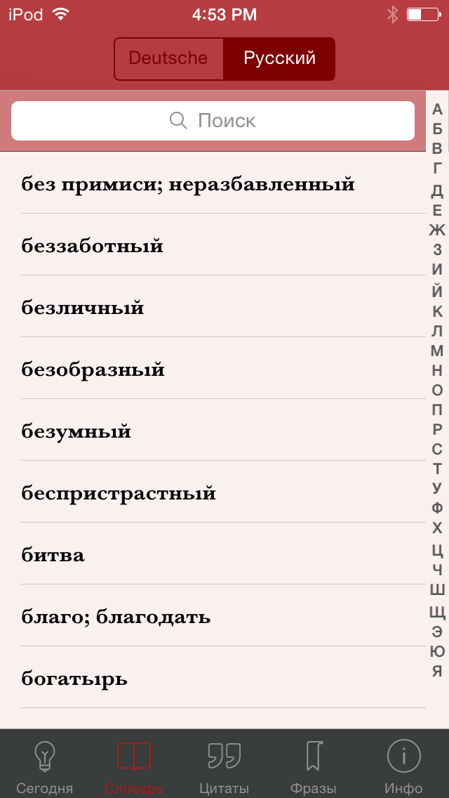 Pivot поможет поддерживать знания немецкого языка на высоком уровне, а так же расширить словарный запас: - Каждый день новая цитата - Каждое ключевое слово связано с "ассоциативной цепочкой" - Примеры применения слова - Частоупотребимые выражения и идиомы - Персональный список избранных выражений и фраз