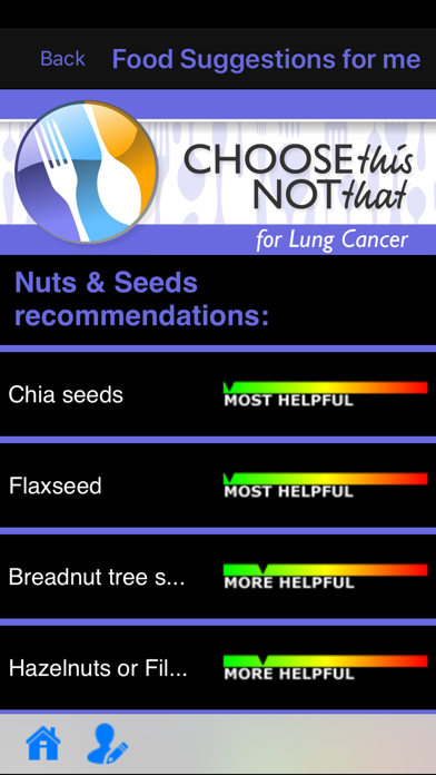 Choose This not That for Lung Cancer. Inside this colorful app, you will find easy to follow suggestions on how to improve your health through nutrition and the food choices you make every day. This app provides comprehensive and actionable nutrition guidelines for how to reduce your risk, prevent and combat Lung Cancer. If you rather tackle health issues and risks through proper nutrition and lifestyle changes then this app is for you! A number of powerful, unique and interactive features make this app so different and superior to others in the market: • Is this food good for me? This feature answers the common question about suitability of various food items for your personal situation. And it does so in an easy to understand and colorful graphic form. • Health issues often come our way in groups of two or more. They are often caused by other health complications or result in other illnesses and risks. It is for that reason, that we have included separate guidelines for those who might be at risk with any of the following common conditions along with Lung Cancer: depression, gout, high blood pressure, high cholesterol, obesity, stress and Vitamin D deficiency. Also included are separate guidelines for detoxification, anti-inflammation & alkaline diets. • Top-5 recommendations on what to eat/do, and what not to. • Food Suggestions. The best food and recipe choices within a food group, based on your personal profile. An extremely valuable tool when at restaurants or when grocery shopping. Also included are suggestions on appropriate life style choices, alternative therapies and herbal remedies, when such options are promising and available to you. • ACTIONABLE information on what is good, what is bad, and what is neutral for your condition(s). We single out specific food items, and give you an ordered list of helpful and harmful foods within each food group. Suggestions presented in this app are based on the content licensed from Personal Remedies, LLC. The primary sources used by Personal Remedies are US government sources such as USDA (US Department of Agriculture), NIH (National Institute of Health) agencies, and leading clinics & universities. Personal Remedies is the publisher of the largest collection of health and nutrition apps for chronic conditions in the market. It is based in metro-Boston, home to the highest ranking healthcare providers and academic institutions in the world. This app is updated by our team on an ongoing basis. Updates happen seamlessly, and do NOT require frequent inconvenient downloads. “This technology was developed using the most current clinical evidence-based information that is available in the US. Behind this technology there is a team of expert clinicians, scientists, endocrinologists, oncologists, and other specialists who are passionate about bridging the gap between expert knowledge and the patient.“ Katya Tsaioun, PhD, Nutrition, Tufts University; L.D.N. “Proper nutrition and other alternative treatments show great promise in preventing and treating many of the illnesses that we deal with every day. I encourage all my patients to follow appropriate nutrition and research other options for themselves. The Choose This Not That series are an excellent step towards improving people’s knowledge in this area.” Shahin Tabatabaei, MD Mass General Hospital; Harvard Medical School “The Choose This Not That series of apps provide dietary recommendations focused on common chronic health problems. They are easy to understand and thus easy to implement into daily life. Most doctors would find it difficult to discuss dietary recommendations at the level of detail found in the series. They should serve as a valuable complement in helping people manage chronic illnesses through dietary and lifestyle modifications.” Andrew S. Lenhardt, MD Lahey Clinic, Beverly, MA