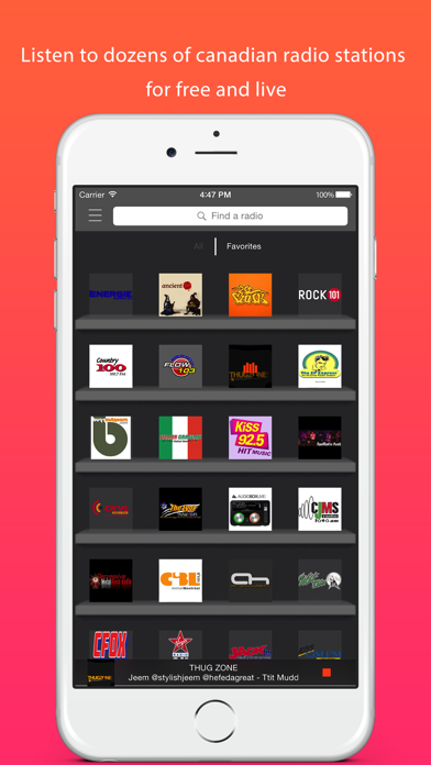 Listen to your favorite radio stations wherever you are with Canada Radios. One click listened to more than 30 radio stations regularly updated days according to your desires. This application requires a mobile internet connection or wifi. Find your favorite radio stations : - NRJ MONTREAL - JAH LIVE RADIO - ANCIENT FM - WE FUNK - CLASSIC ROCK 101 - COUNTRY 100 - FLOW 103 - THUG ZONE - THE EP EXPRESS - BUZZ OUT ROOM - ITALIAN GRAFFIATI - KISS 92.5 - RANT RADIO PUNK - CKVL COUNTRY - LYNX CLASSIC ROCK - AUDIO BOX LIVE - CJMS - DEPRESSIVE METAL ROCK - CIBL - AFTER HOURS FM A radio is missing? Use the contact form and we will add it quickly. Recent music, old, electro, canadian variety, full of info and much more ... everything is there! So go ahead, download it, it's free.