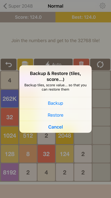 Super 2048 Plus is an upgraded version of the current popular games of 2048. No Ads New game modes added. Now you can play 17 different games! (3 classic mode, 14 super mode). You can choose one of the following game mode: ---- Classic Mode: + Classic: When two tiles with the same number touch, they merge into one. + Time Trial: It pop up a tile every some seconds, merge the tiles as fast as possible. It will game over after the tiles full all grids. + Time Rush: Challenge more scores and greater numbers in limited time. ---- Super Mode: + Normal: When two tiles with the same number touch, they merge into one. + Threes + Tile X: X tile can not be merged. + Gravity: It will always move down once after you move the tiles. + Negative + Fibonacci + Survival + Merge Any + Always 2 + Tile 0 + Time rush: Normal + Time rush: Threes + Time rush: Negative + Time rush: Fibonacci Added game board size selection! Choose the game board size you like from: 3x3, 4x4, 5x5, 6x6, 7x7, 8x8 *** Features: - Backup / Restore: Backup tiles, score value... so that you can restore them. - Undo: Back to last step. - Auto move: Auto move the tiles until you stop it. - Remove tiles: You can remove a tile on game board. - Auto Save current game progress and scores. - Settings: Sound, Feedback, Clear Database...etc. ............ (*) How to play: - Like play with 2048 - Swipe to move all tiles to merge them together. - Your score will increase as fast as more cell you will combine. - Try to get greater numbers and more scores. Join the numbers and get to the 2147483648 tile! Swipe to move all tiles to merge them together. Get 2147483648 in one tile to win a game! Explore deep challenge for your mind! It is a super 2048 free, It has more features. Super 2048 Plus is a upgraded version of 2048. More fun and addictive puzzle game. More and more people joined the Super 2048 Plus game, play it and enjoy it.
