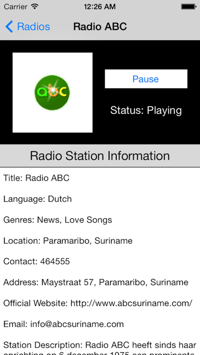 This Suriname Radio Live Player app is the simplest and most comprehensive radio app which covers many popular radio channels and stations in Suriname. One of the great features provided in this app is that this app support multitasking / background mode. This means that you can listen to any of your favorite Suriname radio channel and in the mean time, do other stuffs with your device such as reading books and browsing websites. Listen, enjoy, and let your favorite radio channels and music accompany you anywhere anytime :D The radio channels included in this Suriname Radio Live app but not limited to are (some will be added in the next update): Anjisa FM Radio 10 Magic FM Radio Apintie Radio Boskopu Radio Brasil Suriname Radio Garuda Radio Ishara Radio Noer Radio Radika Radio Rasonic 1 Radio Rasonic 2 Radio SRS Suriname RP Acme Rp The Hot one RTV Mustika Shalom Radio Sky Radio Smooth FM Trishul Radio
