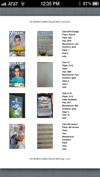 My Sports Cards Collection allows you to keep with you and keep track of your collected Sports Trading Cards. You can import photos of your cards from your ipad/ipod/iphone or you can take a photo of each to add it. You can add notes and information about each card that you have collected. You can create CATEGORIES to classify each card in your collection. You can SAVE to your device, or EMAIL your collection in a PDF file format. This program is simple to use, yet has good attention to detail. You can look at your photo's of your cards and zoom in on them as if looking at any photo on your device.