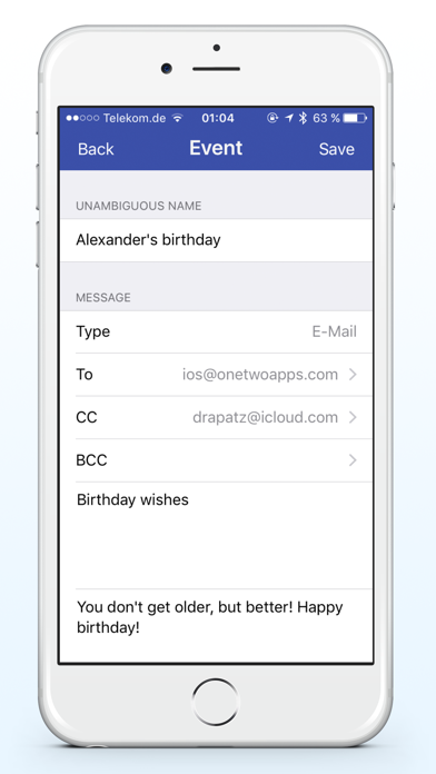 'My year' is the perfect companion for your daily life. Who doesn't know that situation - countless dates have to be kept in mind and suddenly your favourite grandmother's birthday is just around the corner, but unfortunately the right present has yet to be found. This scenario occurs way too often, which is exactly why this app can help you. Install 'My year', invest 30 minutes of your time into configuring the app and you will never miss an appointment again. The following features distinguish 'My year' from other calendars in the App Store: See everything at a glance Due to the modern and simple user interface, you can see at a glance which appointments are coming up in the near future. Since date, time, and the amount of days until the event are displayed, you always know exactly how much time will pass until, for example, your well-deserved holidays begin. Complete integration When setting a new date, you can also choose which of your contacts should also be reminded of the event. It is even possible to select entire user-defined groups. Automatic reminder to user groups As soon as you have chosen your user group for a date, 'My year' automatically imports the corresponding contact information and you can choose how the other users should be reminded. Available for selection are WhatsApp, SMS, e-mail, or telephone calls. In case you would like to notify the chosen contacts via WhatsApp, SMS or e-mail, you may prepare a message in advance, so that you simply have to press "send" on the due date. If you prefer calling, the number is displayed automatically in the push notification, you just have to press once to be connected immediately. Please be aware of the fact that certain functions aren´t available on all devices (e.g. the telephone-app on the iPad). The perfect template for your appointment Choose from a variety of templates or create your own. 'My year' allows you to save the perfect text for every occasion, which will then be sent automatically. Your calendar in safe hands With iCloud you can create a backup of your calendar and, at the same time, use it on other Apple devices. Diversity Our App is available in many languages; choose between German, English, Dutch, Spanish, Portuguese, French and Italian. We would like to provide our app in additional languages. Should you have time and be interested, we would be happy if you translated our resource file (Excel) and the iTunes description (Word) into any language. Please write an e-mail to [email protected], so that we can discuss the process. Thank you! If you have more questions about the app, visit our homepage. Please get in touch via the app, to ask questions or make suggestions. We are grateful for every e-mail we receive. We make an effort to respond to all e-mails in person as quickly as possible. If there are any problems, please don't just write a bad review full of questions. As we cannot read all reviews, we won't receive your questions this way.
