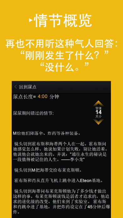 当你在影院看电影中途想上厕所时,RunPee会告诉你何时是最佳尿点,让你不错过关键情节或是影片高潮。同时你还可以看到自己在尿尿期间错过了什么情节、影片结尾是否有彩蛋。如果是3D影片,你还能参与投票或是参考大家的投票,某部影片究竟是不是值得看3D。而RunPee China就是RunPee的中文版。我们的电影资料库会在影片上映时第一时间更新。