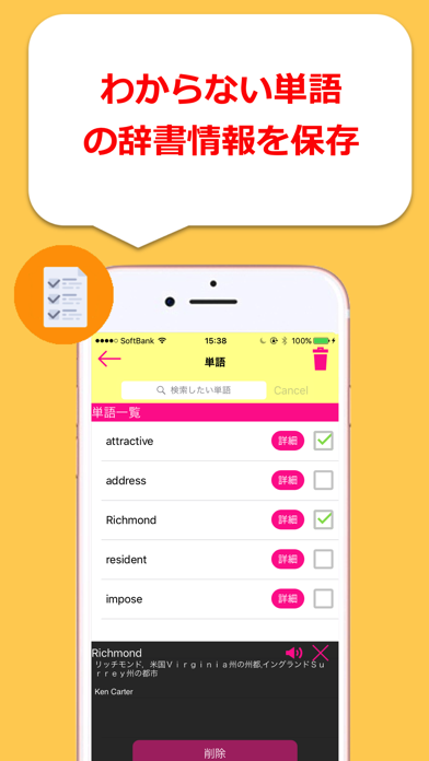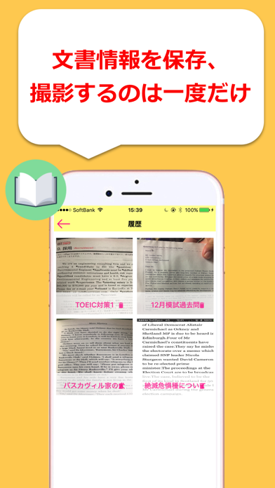 英文をカメラで撮影し、iphone上でワンクリックで単語の意味と例文が出てくるアプリ「camEra」の登場です! 学校で配られる英文のプリントや、分からない単語ばかりの専門的な英文も、いちいち辞書を引かずにワンクリックで意味確認! iPhone片手に布団でゆっくり気分転換して英文が読めます。 -------------機能一覧----------------- ◎辞書機能:英語の文章をいちいち辞書を引きながら紙媒体で読むのがしんどい......。そんな時にはcamEra君!Iphone上で単語をワンクリック で意味と例文、熟語や発音が確認できます。 ◎テキストノート:一文の翻訳結果を保存しておきます。一文ずつ保存できるので、言い回しなどの確認に使えます。 ◎単語一覧:英文でチェックした単語とその意味を保存しておきます。復習に役立ちます。 ◎翻訳機能:文を翻訳する機能がついています。 -----------注意点--------------------- ◎日本語等の、英語以外の言語は認識できません。なるべく、英単語のみの文章の撮影をお願いします。 ◎光や影で画像が粗くなったり画質が下がると、文字を正しく認識できないことがあります。なるべく、そのような要因を避けて使用していただくようお願いします。 ◎撮影する英文の媒体(紙など)は、なるべくたいらな状態で撮影していただくようお願いします。媒体が曲がっていたりすると、正しく文字を認識できないことがあります。 ◎ネット環境(LTE等)必須。 ◎スクリーンショット未対応。 ◎手書きの文字は対応しておりません。印字のみを対象としております。 アイコンデザイン:moekonet http://moekonet.lix.jp