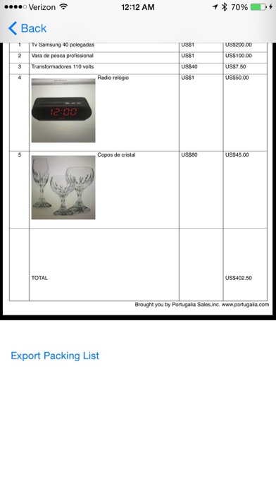 With this app, you can use your Iphone or Ipad to create a "Packing List" for your shipment or container.You can include pictures of itens taken right from your phone. You can configure the language from English to Portuguese and the currency as well.