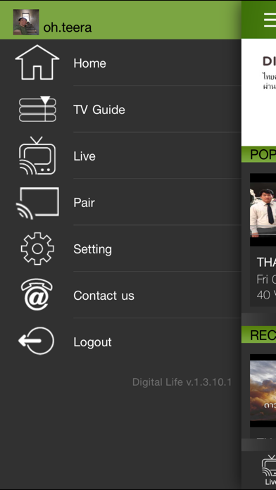 The Digital Live is application of tv anywhere service from Thaicom. This is additional service for Thaicom customer, We delivery content to end-user with high speed and high definition. Application is supporting to watch live, on demand and time shift feature supported for live TV. Features - Record : For store selected content for watching with VOD - Favorite : Manage favorite channel and program
