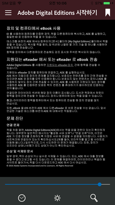 iPad, Mac 또는 PC에서 모든 Adobe DRM 보호 책용의 유일한 eBook 판독기입니다. ADE(Adobe Digital Editions)는 무료로 다운로드하여 사용할 수 있으며, 광고가 전혀 없습니다. ADE는 온라인과 오프라인으로 EPUB 및 PDF 책을 읽을 때 사용합니다. ADE로 사용할 eBook을 여러 공용 도서관에서 빌립니다. PC에서 iPad로 책을 전송하여 읽기 환경을 확장합니다. 멋진 사용자 정의 도서관에 책을 구성합니다. 대화형 기능, 비디오 등으로 채워진 멋진 미디어가 풍부한 책을 경험해 보십시오. ADE의 EPUB3 표준 지원을 통해 오디오와 비디오 내용의 일관된 렌더링, 선명도를 유지하며 동적 이미지 크기 조정, 여러 열 레이아웃, 대화형 퀴즈 및 수학 공식 지원을 수행할 수 있습니다. • 다른 글꼴 크기 및 5가지 읽기 쉬운 페이지 모드 중에서 선택 • 좋아하는 구절 강조 표시 및 내장 책갈피 기능으로 메모 추가 • 강력한 검색 기능을 사용하여 책에서 쉽게 단어나 문자 찾기 • 야간 모드를 사용하거나 화면 밝기를 조정하여 모든 환경에 완벽한 조명 찾기 • 매일 독서에 할애하는 시간 통계 내기 http://www.adobe.com/special/misc/terms.html에서 다운로드하면 사용 약관에 동의하는 것입니다.