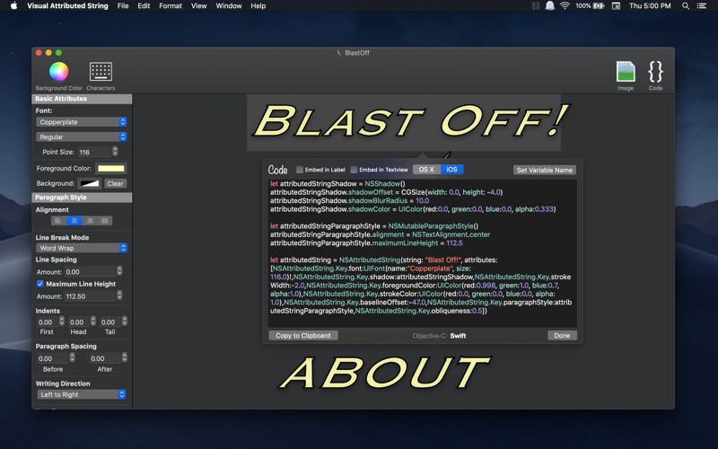 Create NSAttributedStrings for your iOS and Mac applications by simply writing text and applying effects to words and paragraphs in the document like you would in any word processing application! Visual Attributed String is the most advanced WYSIWYG (what you see is what you get) editor for attributed strings, providing rich features including: -Platform Specific Code: generate code to create NSAttributedStrings for both iOS and OS X. -Generates both Swift AND Objective-C code! -Get the code for your entire document by clicking “Code” in the toolbar! -Get the code for only selected portions of text by right-clicking and selecting the “Code for Selection” menu item! This allows you to get code for individual words/paragraphs as you need them on a long document with many different text styles! -Save your text as an image to use for the web! You can also generate images for only selected portions of text by right-clicking and selecting the “Image for Selection” menu item! Supported image formats include: .png, .bmp, .tiff, and .jpeg! -Smart Code Generation: Visual Attributed String is smart enough to generate code for non-mutable attributed strings (NSAttributedString) and mutable attributed strings (NSMutableAttributedString) based on your typed text! -Set Unique Variable Names: Generate attributed string code with your own unique variable names! You can generate code for specific buttons/labels by using your own unique variable names. Visual Attributed String is here to help, but you are still in control! -Includes Label Maker™! Click the "embed in label" option to generate code to create a label using the attributed string you visually designed (the code will generate a UILabel for iOS and NSTextField for OS X)! -Includes Text View Maker™! Click the "embed in text view" option to generate code to create a text view using the attributed string you visually designed. -Easily add emoji and special characters to your attributed strings by clicking the “Special Characters” toolbar item to bring up the characters palette! -Change the background of the entire document to see how your text looks against different background colors. If you want to get the code for your document’s background color, you can simply right click and select the “Background Color Code” menu item! -Add images to your attributed strings! Just drag and drop an image from Finder onto the window to add images to the document! Did you know NSAttributedString is capable of displaying images? -Custom Font Warning: Visual Attributed String will warn you if your document uses a custom font that is not included in the iOS SDK! -Comes with an Action Extension! You can get attributed string code from any app on OS X that supports Action Extensions with text (such as TextEdit)! -Visual Attributed String is a document-based application and supports features such as autosaving, duplicating documents, renaming documents, and reverting document versions! -iCloud support! Save your Visual Attributed String documents in iCloud Drive. -Powerful yet simple interface for styling text! Visual Attributed String provides an interface for editing many attributes including: ∙Font (NSFontAttributeName) ∙Font Color (NSForegroundColorAttributeName) ∙Font Background Color (NSBackgroundColorAttributeName) ∙Kern (NSKernAttributeName) ∙Skew (NSObliquenessAttributeName) ∙Shadow (NSShadowAttributeName) ∙Underline (NSUnderlineStyleAttributeName) ∙Underline Color (NSUnderlineColorAttributeName) ∙Strikethrough (NSStrikethroughStyleAttributeName) ∙Strikethrough Color (NSStrikethroughColorAttributeName) ∙Link (NSLinkAttributeName) ∙Stroke (NSStrokeWidthAttributeName) ∙Stroke Color (NSStrokeColorAttributeName) ∙Paragraph Style (NSParagraphStyleAttributeName) ∙Tool Tip (NSToolTipAttributeName) ∙Attaching Images (NSAttachmentAttributeName) ∙Baseline (NSBaselineOffsetAttributeName)