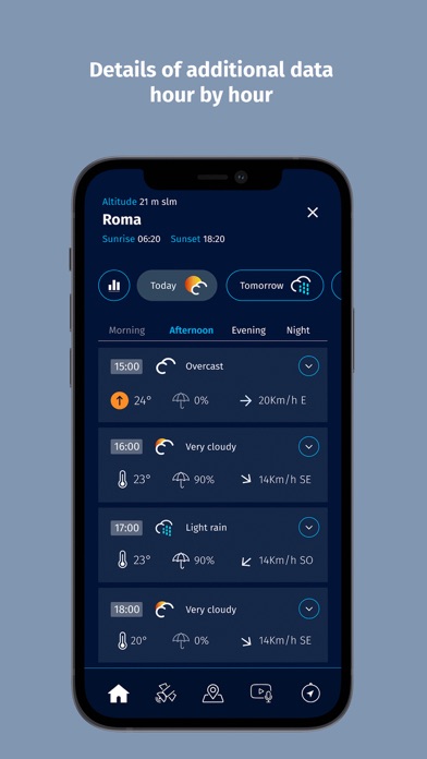 Meteo Aeronautica - App ufficiale del Servizio Meteorologico dell'Aeronautica Militare L'applicazione ufficiale del Servizio Meteorologico dell'Aeronautica Militare (www.meteoam.it) fornisce informazioni meteorologiche previsionali relative al territorio nazionale e previsioni di punto su tutto il mondo. Dichiarazione di accessibilità L’Aeronautica Militare si impegna a rendere la propria APP Meteo accessibile, conformemente alla normativa in vigore. Di seguito si può accedere alla Dichiarazione di accessibilità: per APP ver. iOS: https://form.agid.gov.it/view/82c8b137-6270-48c7-bee4-457d3e51a1b6 Meccanismo di Feedback Per inviare segnalazioni su casi di mancata conformità ai requisiti di accessibilità può essere inoltrata apposita segnalazione direttamente all’indirizzo e-mail: [email protected] . Nell'e-mail è necessario indicare: • nome e cognome, • indirizzo e-mail, • url della pagina web o sezioni del sito oggetto della segnalazione, • descrizione chiara e sintetica del problema riscontrato, • strumenti utilizzati (sistema operativo, browser, tecnologie assistive). L'applicazione Meteo Aeronautica è pensata per fornire all’utente le seguenti funzionalità: Home page • Home page personalizzata con possibilità di inserire fino a quattro località preferite • Previsioni geolocalizzate in base alla posizione del dispositivo • Previsioni con cadenza oraria fino a cinque giorni dei principali parametri meteorologici - stato del cielo, precipitazioni, umidità, pressione e vento Satellite • Diverse tipologie di immagini da satellite e post-elaborazioni di dati satellitari ad alta definizione • Combinazione di dati satellitari con la rete di rilevamento dei fulmini dell’Aeronautica Militare Mappa • Mappa di previsione per l’Italia con animazioni sull'evoluzione di diversi parametri atmosferici nel tempo e nello spazio (precipitazioni, vento, copertura nuvolosa, etc) • Previsioni di punto su tutto il territorio nazionale e su tutto il mondo Esplora • Sezione informativa con contenuti multimediali come video, podcast e altri contenuti multimediali • Possibilità di abilitare le notifiche per ogni nuovo contenuto multimediale pubblicato Meteorologia Aeronautica • Osservazioni aeronautiche sugli aeroporti di tutto il mondo (METAR) • Previsioni aeronautiche sugli aeroporti di tutto il mondo (TAF) Fenomeni intensi • Indicazione sull’emissione di segnalazioni di fenomeni intensi • Possibilità di abilitare le notifiche per le segnalazioni di fenomeni intensi Preferenze • Impostazione di 4 località preferite • Abilitazione geolocalizzazione del dispositivo • Abilitazione e personalizzazione delle notifiche • Impostazione lingua • Informative Privacy, Termini e Condizioni • Contatti Puoi scaricare l'applicazione Meteo Aeronautica dai principali store.