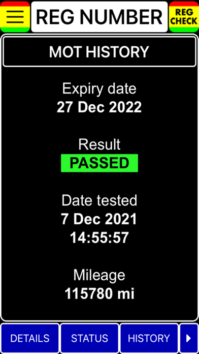 Easily check vehicle TAX & MOT status / history Check Mileage (actual & average miles per year) Share vehicle results by email Type in the REG then tap "REG CHECK" Tap button to view: VEHICLE DETAILS Make Model Colour Cylinder capacity CO2 emissions Fuel type Type approval Wheelplan Year of manufacture Revenue weight Euro status Real driving emissions Last V5C issued VEHICLE STATUS TAX MOT Odometer Since Passed Failed Pass rate MOT HISTORY Expiry date Result Date tested Time test complete Odometer reading MOT Test number Advisory notice with details (if any) Reasons for refusal to issue Certificate with details (if any), VEHICLE MILEAGE Graph showing: MOT test date Avg miles per year MOT test date Odometer reading Miles / Days since USEFUL LINKS Check insurance status Check vehicle tax rates Tax your vehicle Register off road (SORN) Report untaxed vehicle Get MOT reminders Congestion charge SHARE Send search results by email - IMPORTANT NOTICE All vehicle data is provided by the UK Government DVLA database No liability for accuracy of the data will be entered into by the author of this app The information is used at your own risk and must not be used for any illegal purposes