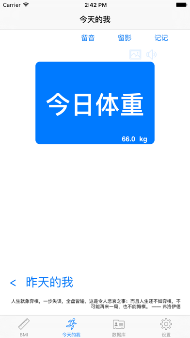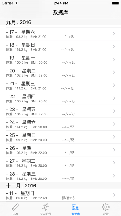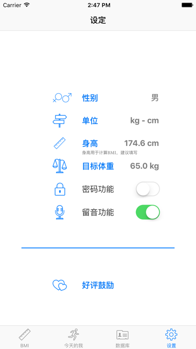 这是一款超级有效的体重记录分析工具 简约专业的操控模式和界面设计给您带来舒适放松的减肥瘦身体验 瘦身健美的理想伴侣,抛弃冗余和浮夸,简洁明了的帮您记录分析每一天的身体数据变化 支持使用照片记录体型日记 还可以使用声音、文字记录您瘦身与健美旅途中的点点滴滴 一键引导体重录入 可以为应用设定登入密码,保护私密信息 集成BMI计算器功能,根据计算结果为您提供参考信息(提供参考信息已优化为更适合我们亚洲人) 多重曲线图可纵向对比几个月的体重、BMI信息,看曲线图的同时还可以沿着曲线触摸数据节点精确定位到任何一天的照片、日记乃至语音记录 支持设定目标体重,随时提醒随时关注 By changing the settings you can calculate in cm or inches and in kg or lbs.