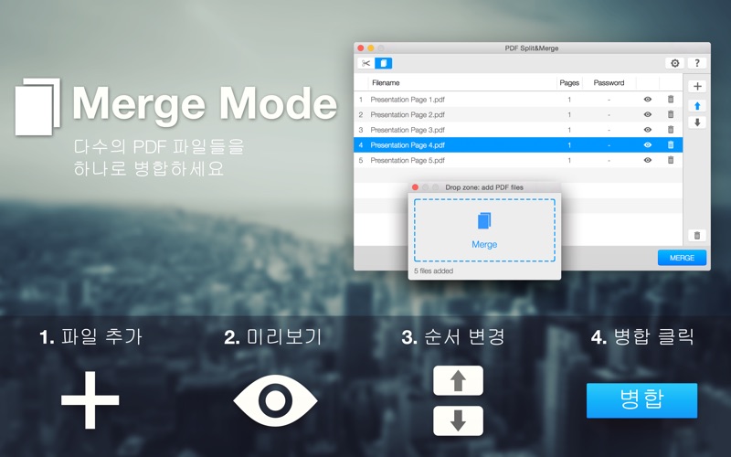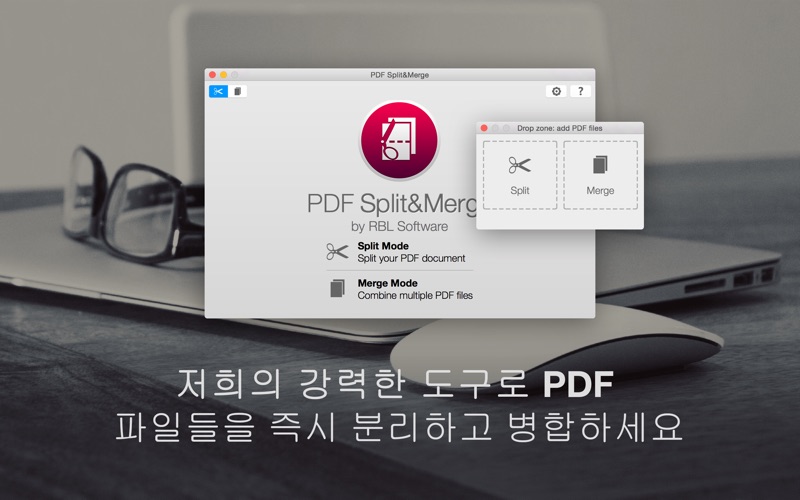 PDF Split & Merge Pro는 PDF 파일들을 쉽게 분리하고 합치는 단일 소프트웨어입니다. PDF 문서들을 분리하는데 네 가지 방법이 있습니다. 혁신적이고 이동 가능한 Drop Zone이 데스크탑, 폴더, 또는 Spotlight에서 파일의 추가를 간소화해줍니다. PDF Split & Merge by RBL Software는 다음에 완벽합니다: • 다수의 PDF 파일들을 하나의 파일로 병합합니다; • PDF 문서들을 하나의 페이지로 분리합니다; • 페이지 번호에 따라 PDF 문서에서 특정 페이지 삭제합니다; • Drop Zone을 이용하여 MAC의 모든 곳에서 파일 추가합니다; • 암호로 보호된 PDF 파일들을 분리하고 병합합니다. 기능: • 두 개의 워크 모드: 하나의 프로그램 내 PDF 분리 및 병합합니다; • 각각의 추가된 PDF 파일들의 미리보기로 정확한 결과 보장합니다; • 문서 병합 전 순서 변경 가능: 선택된 파일을 드래그 및 드롭 또는 화살표를 이용하여 PDF 문서들의 순서를 설정합니다; • Drop Zone은 당신의 데스크탑에서 가장 선호되는 장소로 옮길 수 있습니다: 애플리케이션으로 신속히 이동하기 위해, Spotlight 검색 결과, 열려있는 모든 폴더들 또는 데스크탑에서 바로 간편히 드래그합니다; • 무제한: 원하는 만큼 PDF 파일을 추가하세요. 각 파일의 최대 페이지 숫자는 제한되어있지 않습니다; • 파일의 속성에 문서 작성자를 설정하세요; • 다중 언어 사용자 인터페이스. 네 가지 분리 방법 중 선택하세요: 단일 페이지 파일 문서의 각 페이지는 별개의 단일 페이지 파일들로 저장됩니다. 다중 페이지 파일 "파일당 페이지 수"는 많은 페이지를 포함하는 PDF 파일을 여러 개의 PDF 파일로 분할할 때 분할된 각 PDF 파일에 동일하게 포함될 페이지의 수입니다. 그리고 "시작 페이지"에 설정된 페이지로부터 분할이 시작됩니다. 페이지 제거 여기에서 문서 내의 특정 페이지들을 선택적으로 추가하여 파일 분할에서 제외할 수 있습니다. 페이지 범위 분할할 문서의 페이지 범위(시작과 끝 페이지 번호)를 지정합니다. Yosemite 최적화됨.