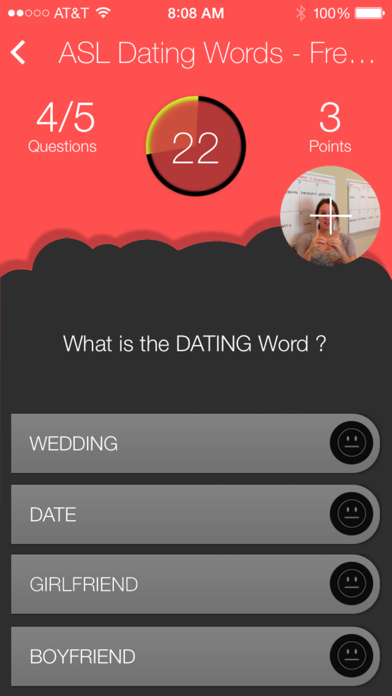This app has 40 Questions about DATING. There are 5 Free Questions and 35 Questions for In-App Purchase. The Questions are in Multiple-Choice Format. A fun way to learn ASL Common DATING, FAMILY AND RELATIONSHIP Words.