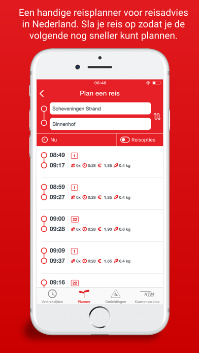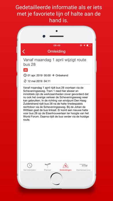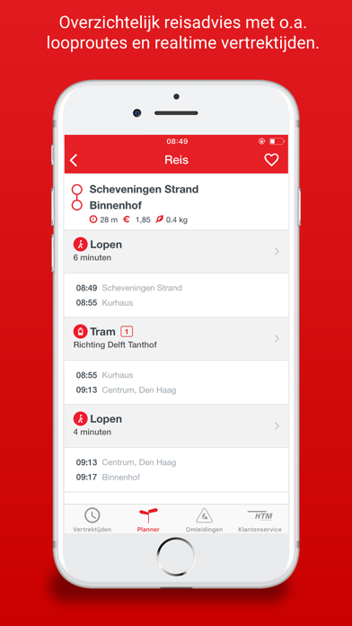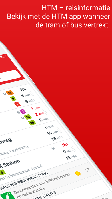 HTM – reisinformatie Op bezoek in Den Haag en onderweg naar de tramhalte ? Met de HTM app kun je snel zien wanneer de tram of bus vertrekt, welke route je kunt nemen, hoe laat je aankomt en of er omleidingen of verstoringen zijn. De HTM app toont real time waar de bus of tram is en laat je aan de hand van je GPS locatie de actuele vertrektijden zien van de dichtstbijzijnde halten, en van je voorkeurshalte. Ook kun je ervoor kiezen om een push bericht te ontvangen als er op je favoriete lijn of halte iets aan de hand is. Je hoeft hier geen account voor te hebben. Je favoriete halten en lijnen moet je wel even (opnieuw) instellen. Je favorieten worden in je telefoon opgeslagen. Wat biedt de HTM app: - Planner met bewaarfunctie Een handige reisplanner voor een reisadvies vanaf je huidige locatie of een zelf gekozen locatie naar een bestemming met bus, tram, metro, trein en veerpont in Nederland. Je kunt de reis opslaan zodat je de volgende keer nog sneller kunt plannen. - Overzicht van alle vertrektijden In de app kun je bij de tab Vertrektijden zoeken op haltenaam of lijnnummer. Nieuw is een overzicht van alle bus- en tramlijnen. Nadat je een lijn gekozen hebt zie je real time de vertrektijden. - Favoriete halte bewaren Door op het hartje naast de haltenaam te klikken maak je een halte favoriet. Deze halte verschijnt standaard in het scherm van Vertrektijden. - Bericht bij verstoring Als je een favoriete lijn hebt ingesteld, kun je ervoor kiezen een bericht te ontvangen bij een omleiding of verstoring. Je stelt dit in door in je favoriete lijn de halte te selecteren. Met het belletje rechtsboven geef je aan dat je een push bericht wilt ontvangen Je kunt dit per lijn, per dag en voor een tijdvak instellen. Je hebt er geen account voor nodig. - Voertuig op de kaart zien Als je een halte of lijn hebt geselecteerd, zie je op de kaart de actuele posities van voertuigen op deze lijn en of die op de gekozen halte stoppen. Je ziet dus direct waar de bussen of trams zich bevinden. - HTM Fiets Als je een halte of lijn hebt geselecteerd, zie je op de kaart de actuele posities van de HTM Fietsen en die van een aantal andere aanbieders. Dit werkt ook in de reisplanner.