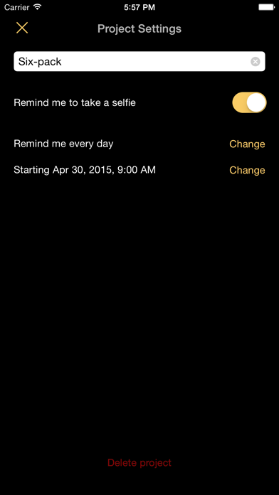 Monthie Sports offers you an easy way to track your progress in building up muscles, loosing weight, or flexibility training. You can organize your photos in dedicated projects like 'Six-pack', 'Right split', or 'Back flexibility', and compare the images you add over time. For each of the projects you can set up a reminder to take a new photo every day, week or month.