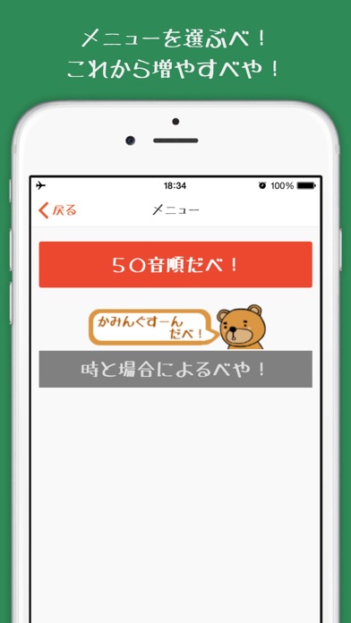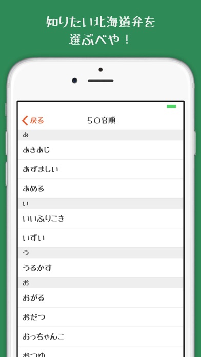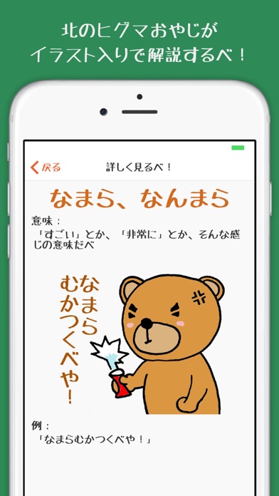 北海道人のバイブルとすべく、 北海道好きや、旅行のお供にもオススメなアプリをつくったべ! 使い方は、いたって簡単だべ 1. TOPページで、[使ってみるべや!!]ボタンをクリックするべ 2. メニュー画面で好きなメニューボタンをクリックするべ ※バージョン1.0.5では、[50音順だべ!]のみだべ 3. 北海道弁の一覧が出てくるから、気になる北海道弁を選ぶべ 4. 詳細ページで、北海道弁の意味や、使い方がわかるべ 全ページ、ヒグマおやじのイラスト付きだべ! これだけだべ! あと、 今後のバージョンアップの予定はこんな感じだべぇ ・Ver. 1.0.0に入りきらなかった北海道弁の追加 ・「時と場合に分けた北海道弁一覧」の追加 ・音声の追加 などを予定してるべ~ よろしく頼むべぇ~