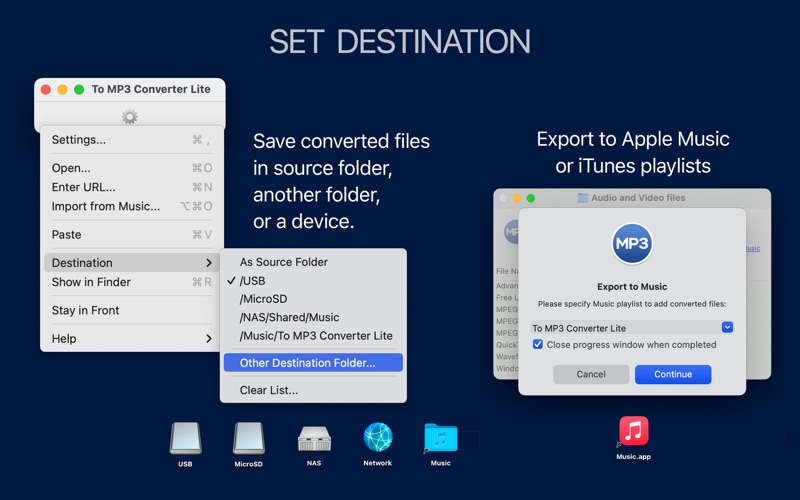 To MP3 Converter Lite encodes more than 200 audio and video formats to MP3 in one click. Get quality MP3 effortlessly: • Convert audio or video to MP3 in one click • Get the best possible MP3 quality with auto settings • Transfer tags from source files or load them from files and folder names • Add converted files to Apple Music or iTunes playlist. INPUT FORMATS* To MP3 Converter Lite accepts and processes more than 200 audio and video formats, including but not limited to WMA, MP4, M4A, FLAC, WAV, VID, FLV, AVI, MPG, ASF, MPE, MOV, 3GP, M4V, MKV, MOD, OGM, DV. AUTOMATIC OUTPUT SETTINGS To MP3 Converter Lite can analyze Bit Rate, Sample Rate, and Channels and apply optimal settings to output MP3s. As a result, it guarantees the best possible sound quality and saves time and hard drive space. If you want to convert to a particular Bit Rate, Channels, etc., select the required settings in the Preferences/Format. VOLUME NORMALIZER You will enjoy better audio quality thanks to the built-in MP3 booster and equalizer. It automatically boosts or equalizes the loudness of music, speech records, and voices in movie soundtracks. At the same time, it will not change the already adjusted audio volume. EXTRACT ALL AUDIO TRACKS FROM A VIDEO Most audio converters extract just one soundtrack from movies. However, you must find special software to extract multiple audio tracks from a video. To MP3 Converter Lite is an ideal option for extracting every audio file from a movie. CONVERT ENTIRE AUDIO COLLECTIONS WITH PREMIUM FEATURES To MP3 Converter Lite is free to download and use. However, it has limitations for some features, such as batch processing, audio effects, tag downloader, and auto-organizer. Premium Features subscription removes these limitations and lets you convert to perfectly tuned and organized music collections in one click: • Batch processing – convert thousands of files and folders at once • CUE splitter - split music albums to separate tracks with CUE files • CD ripper – get quality and labeled songs from CD albums • Tag downloader - pull MP3 tags from files, folder names, and music metadata databases. • MP3 organizer – rename and organize output MP3 files into folders and playlists according to artists, genres, albums, and other music metadata. • Audio effects – listen to songs with a smooth fade in/out & without silence. Subscriptions will be charged to your iTunes account. Your subscription will automatically renew unless canceled at least 24 hours before the end of the current period. You can manage your subscriptions in the App Store Account Settings. CUSTOMERS SUPPORT Please email [email protected] about any problems or feature requests. Also, if you like To MP3 Converter Lite, we would appreciate a review at the App Store. Read the Terms of Use for "To MP3 Converter Lite" at https://www.apple.com/legal/internet-services/itunes/dev/stdeula/. *Note: Conversion of M4P (protected AAC audio files) and VOB files to MP3 format is not supported. **Note: Downloading music and videos from YouTube, Vimeo, and other similar services containing copyrighted content is not supported.