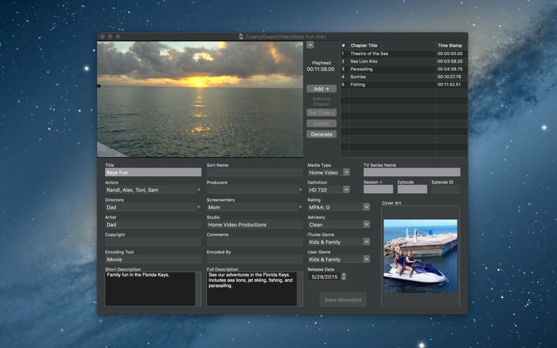 MetaDoctor is a comprehensive and powerful video metadata editor for your .mp4, .m4v, and .mov video files. Specially designed to work with iMovie, the TV App and Apple TV - tags, cover art, and chapters can be edited easily and efficiently in a single convenient window. Edit the video file metadata with MetaDoctor, import into the TV App, and enjoy your videos on your Apple TV complete with descriptions, art work, and chapters. Chapters can be added with ease using the built-in video pane. Scrub the video to the desired frame, click a button, and the chapter is automatically inserted at that exact time. No copying, pasting, or typing. Changing chapter times is just as easy. Cover art can be imported either from an image file or using copy and paste, and adjusted and cropped within MetaDoctor using the built-in image editor. The Pro version, available as an upgrade, includes several additional advanced features. Metadoctor Pro can copy the metadata from another video file, a great feature for quickly adding metadata to a video file that has been edited in iMovie, for example when additional video footage is added. Chapters can be added at any desired interval using the chapter generate function. MetaDoctor Pro can also scan the video for scene cuts and automatically suggest chapter points. Cover art can be set from any frame of the video with one click. Batch mode feature allows editing of multiple files simultaneously. MetaDoctor Pro also includes TMDb lookup of metadata for your purchased content, and a web search capability for chapter titles. MetaDoctor is an advanced multi-threaded application that takes advantage of multicore processing and the latest macOS technology to provide the highest level of performance. Multi-gigabyte video files are loaded and written nearly instantaneously.