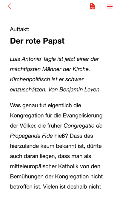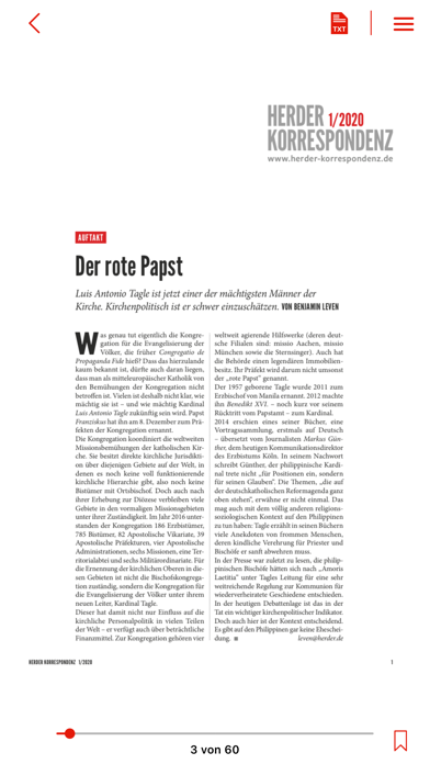 Mit der Herder Korrespondenz wissen Sie genauer, was sich religiös, kirchlich und theologisch in unserer Zeit abspielt. Analysen, Interviews und Kommentare, die Hintergründe ausleuchten, den Blick auf die christlichen Kirchen in aller Welt richten, auf bester Sachkenntnis und sorgfältiger Recherche beruhen. Die Herder Korrespondenz ist nicht irgendeine katholische Zeitschrift. Sie steht im deutschsprachigen Raum und weit darüber hinaus für Niveau, Seriosität und Unabhängigkeit in der Berichterstattung über Kirche und Religion. Die Herder Korrespondenz erscheint monatlich. Pro Halbjahr erscheint zusätzlich eine Spezial-Ausgabe. Lesemodus Beginnend mit dem Heft 11/2017 können Sie alle Artikel auch bequem mit dem integrierten Lesemodus lesen. Die Schriftart und -größe der Artikel lassen sich hierbei individuell anpassen. Wie in einem eBook! Alle Ausgaben sind nach dem Download auch offline verfügbar. Wir sind sehr daran interessiert, unsere Apps kontinuierlich zu verbessern. Senden Sie Ihre Anmerkungen und Verbesserungsvorschläge gerne per E-Mail an [email protected]. Wir freuen uns natürlich auch über Ihre Rezensionen.