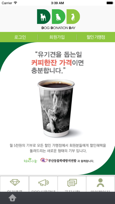 유기동물 보호기금 기부 어플 DDD "유기견을 돕는일 커피한잔가격이면 충분합니다. 오늘하루 몇잔의 커피를 드셨나요?" 직접적인 기부활동에 대한 부담으로 참여도가 낮은 유기동물 기부문화에 반려동물을 사랑하는 마음을 전해드릴수있는 중간자 역할로 DDD가 만들어졌습니다. 부산동물학대방지연합과 함께하는 DDD는 월 5000원의 기부로 회원님께는 할인혜택을 드리고 유기동물 보호활동을 진행할수 있는 기부금을 동물단체에 전달합니다. 매월 유기 동물 보호활동 결과는 어플에서 공지사항으로 알려드립니다.